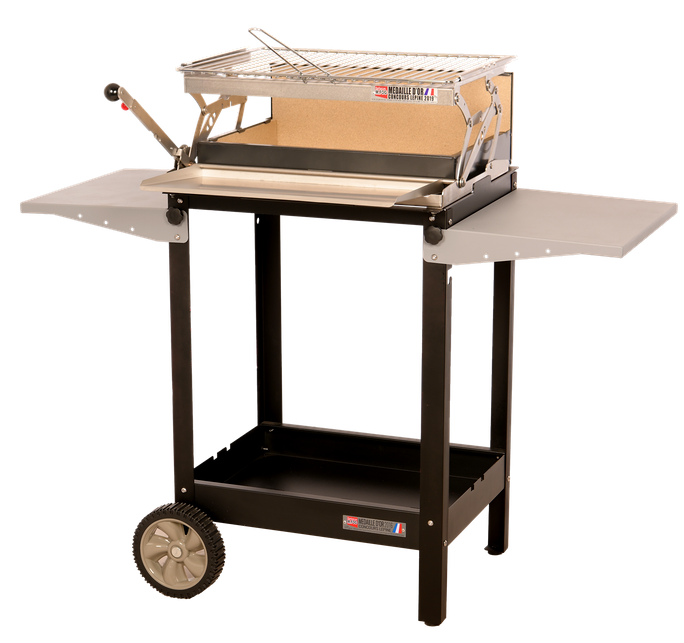 Le chariot est également doté de deux tablettes latérales repliables, offrant un espace de travail pratique pour poser plats, ustensiles, assaisonnements ou aliments avant et après cuisson. Ces tablettes améliorent considérablement l’ergonomie lors des grillades.